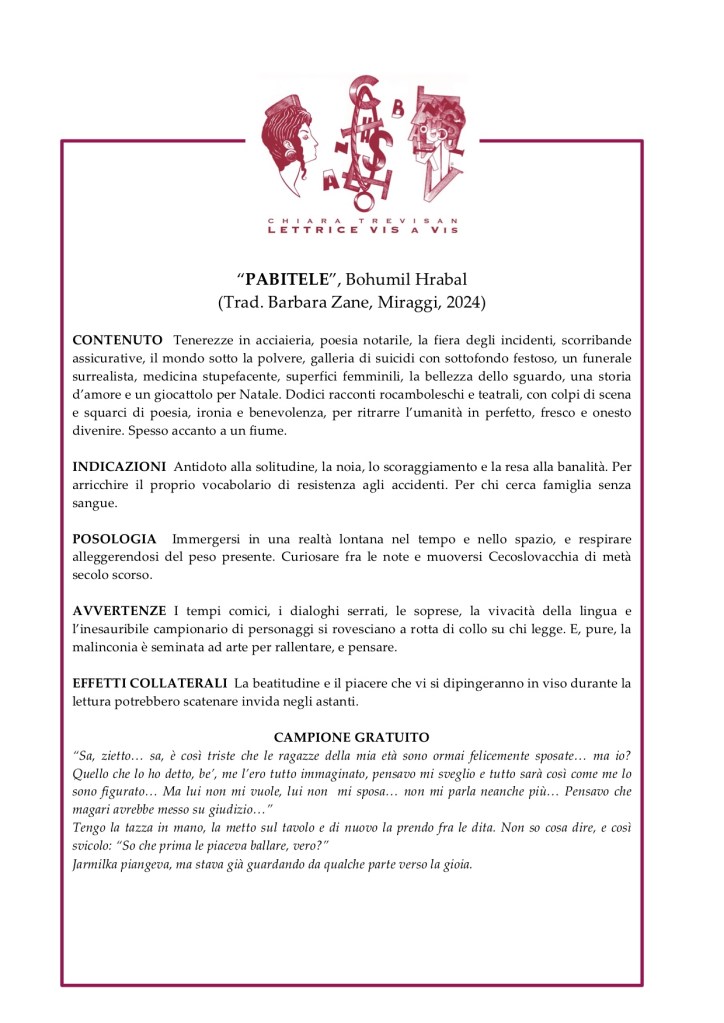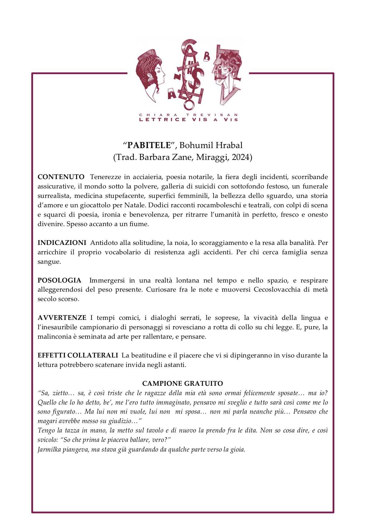 Un incontro-collage, nel quale 8 libri vengono presentati con la formula del bugiardino (dire abbastanza senza dire troppo, e permettere a ogni lettore di trovare il libro giusto leggendone ingredienti, indicazioni, avvertenze e consigli di somministrazione), accompagnati da brevi letture, e legati gli uni agli altri da suggestioni della Lettrice e dei partecipanti.