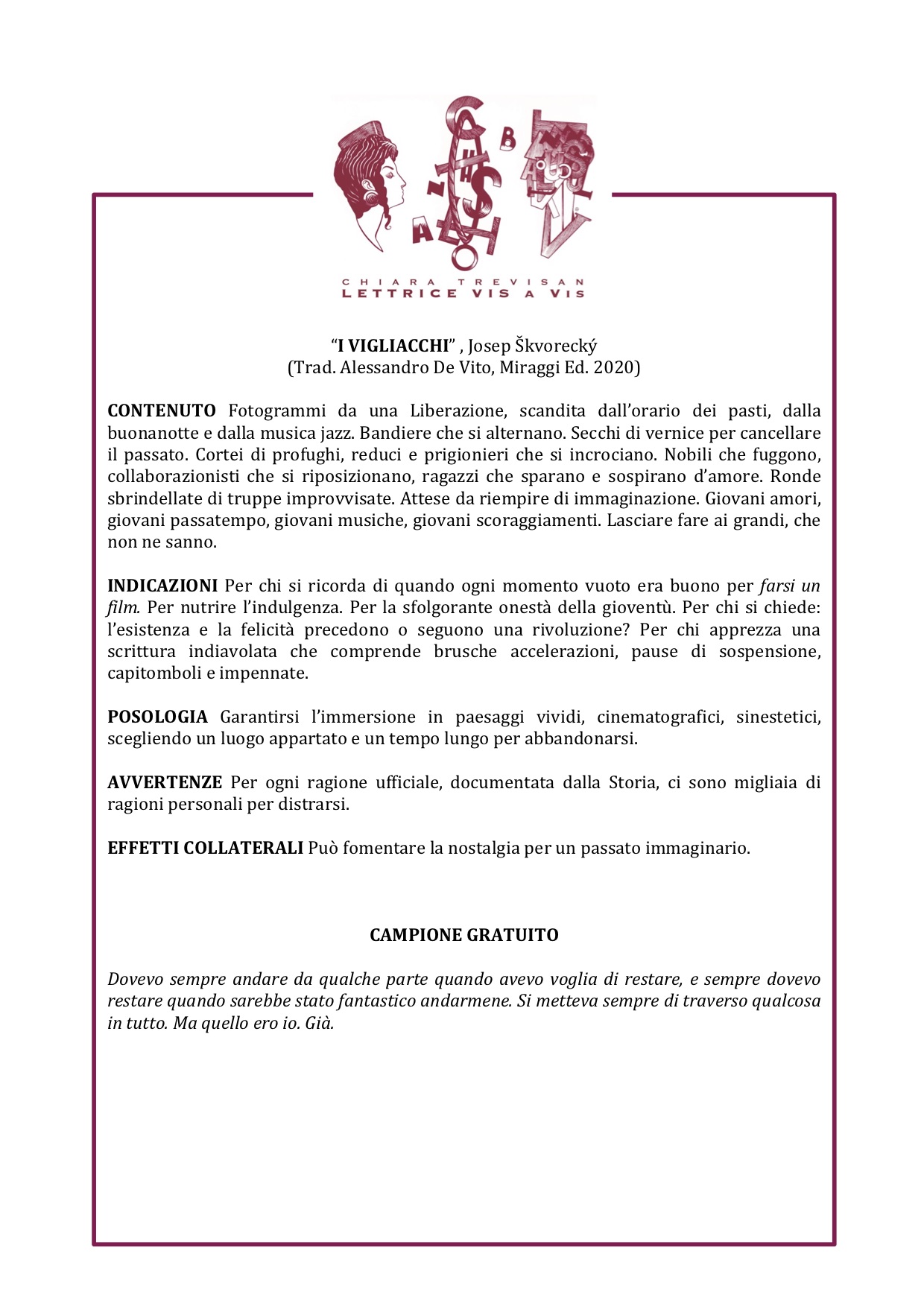 INDICAZIONI: Per chi cerca di mettere ordine, ma distrarsi è un attimo; per amore della dialettica; perché tra il bene e il male passa un sacco di ironia; perché se non c’eri la racconti meglio