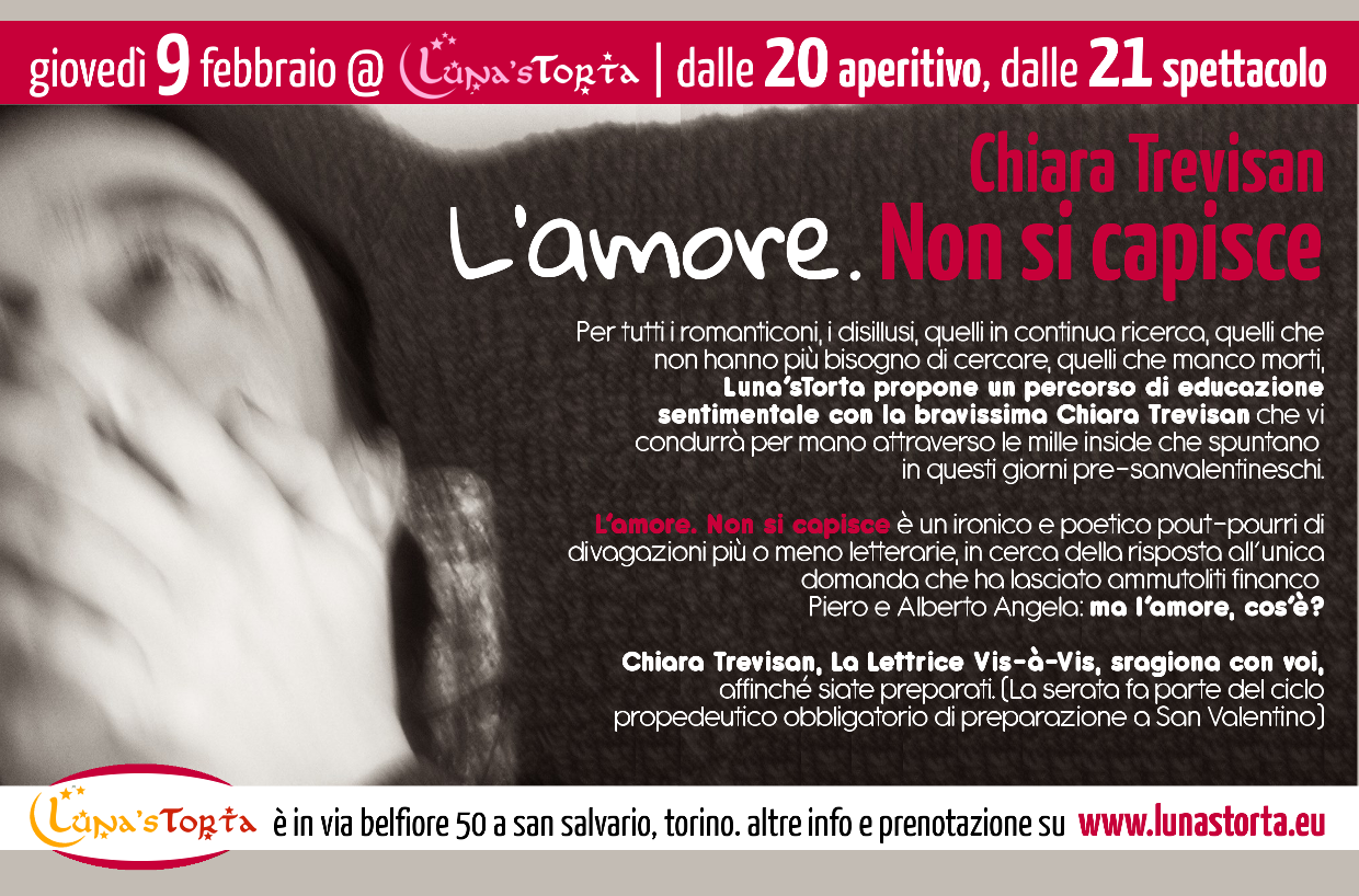 Voi lo sapete? Non lo sapete? Credete di saperlo? Ancora meglio, non ve ne frega niente? Venite alla Luna’s Torta il 9 febbraio: sarete in ottima compagnia. L’AMORE. NON SI CAPISCE.